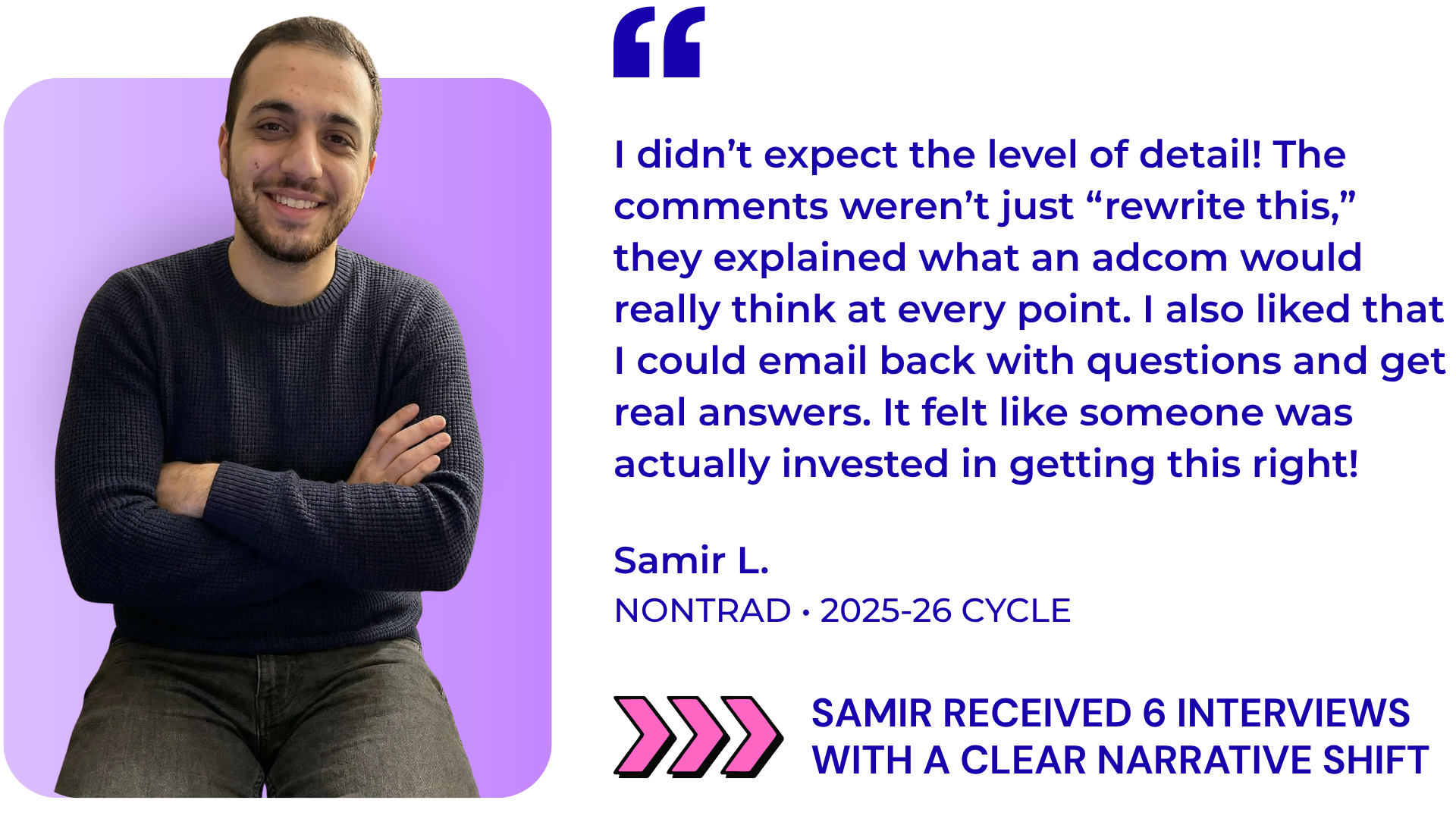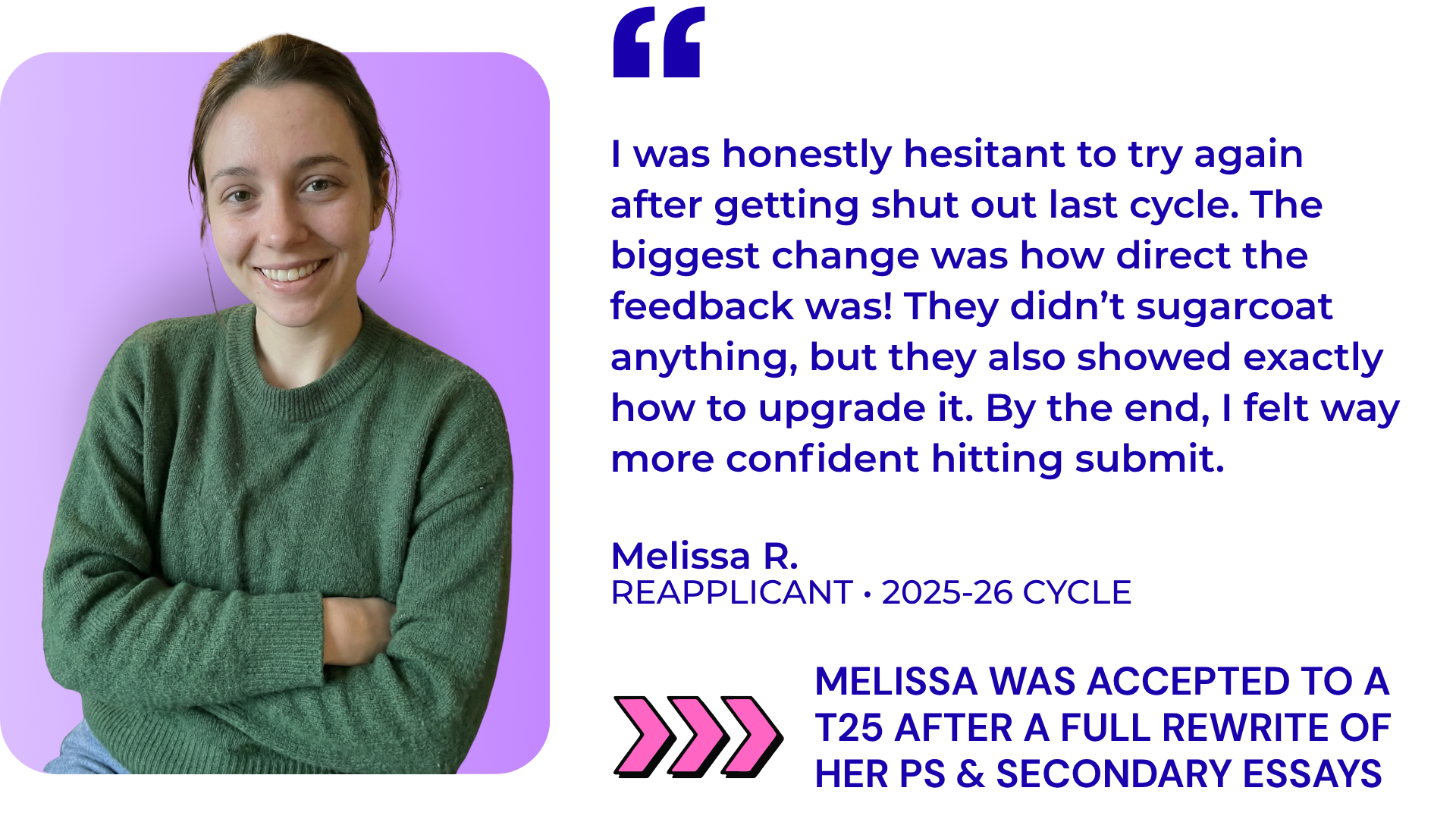 Read stats, narratives, and journeys from 50+ students we've worked with across T10, T20, & T30 schools. See accepted student profiles 》